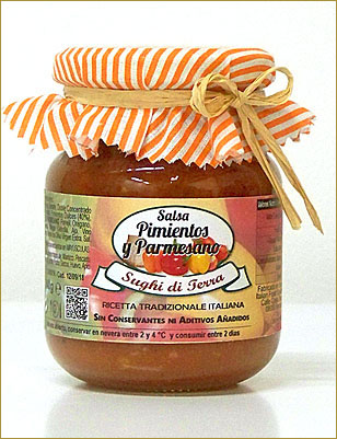Name: Salsa Pimientos y Parmesano Code: SUT12B Net Weight: 240 g Italian sauce for pasta and other cereals, very high quality. made exclusively with Extra Virgin Olive Oil and 100% Italian Tomato Pulp. Ready to consume without manipulations of the product. Condimenta abundantemente hasta 450-500 gramos de pasta cocida. Conservation temperature: Environment Shelf Life: 24 months from the date of manufacture. Tomato Pulp, Tomato Paste, Roasted Tricolor Sweet Peppers, Orégano, Black Pepper, Onion, Garlic, White Wine, Extra Virgin Olive Oil, Iodized Salt.
